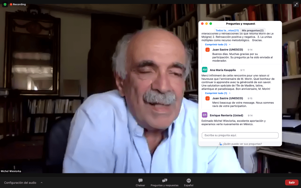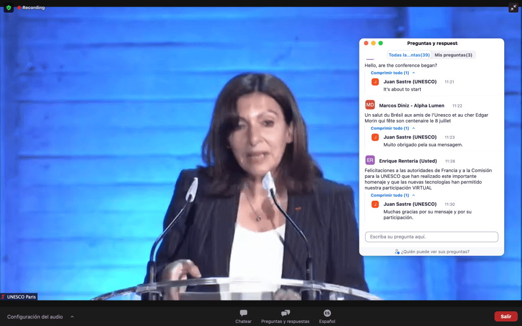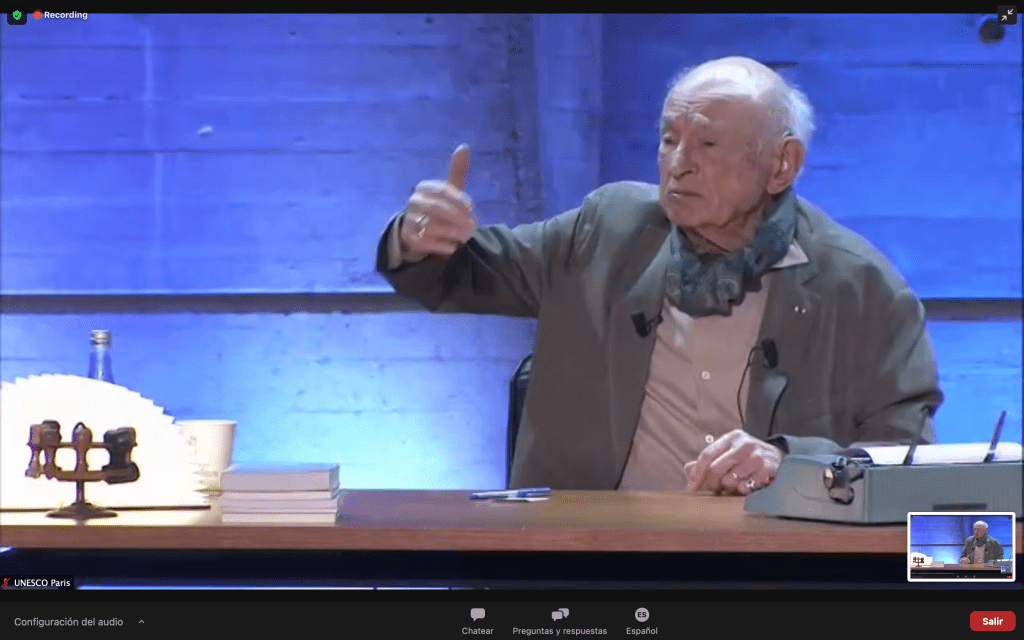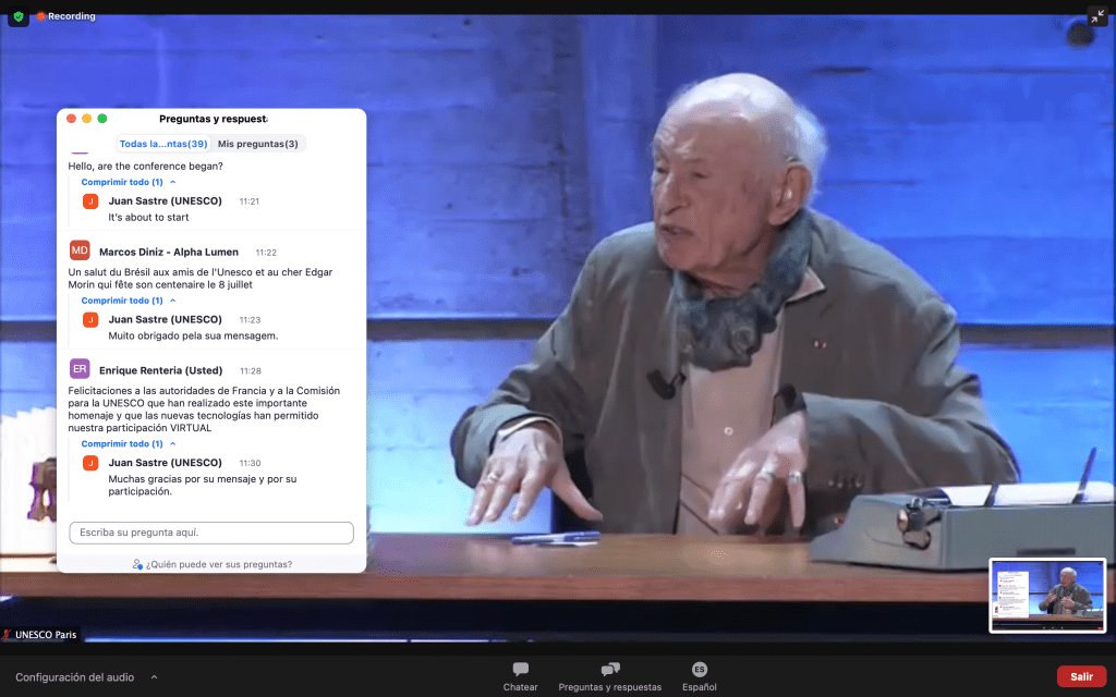 En el transcurso de la ceremonia de homenaje, Edgar Morin narra pasajes de su vida y sus reflexiones sobre la construcción del pensamiento complejo fue una conferencia excepcional. Hicieron uso de la palabra, entre otros, las siguientes personalidades: Anne Hidalgo, alcaldesa de París; Audrey Azoulay, directora general de la UNESCO; Véronique Roger-Lacan, embajadora y delegada permanente de Francia en la UNESCO e Yves Saint-Geours, presidente de la Comisión Nacional francesa para la UNESCO.